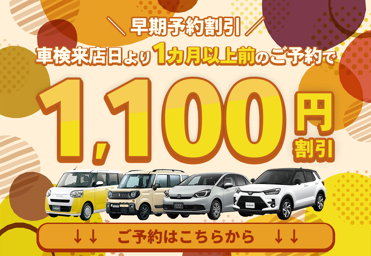 11/30(日)までにご予約で−1,100円 ※早期予約割引の適用は、車検来店日より1カ月以上前にご予約いただいた方のみとなります。 |