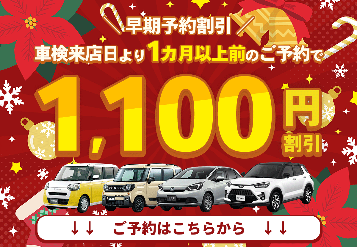 12/31(水)までにご予約で−1,100円 ※早期予約割引の適用は、車検来店日より1カ月以上前にご予約いただいた方のみとなります。 |